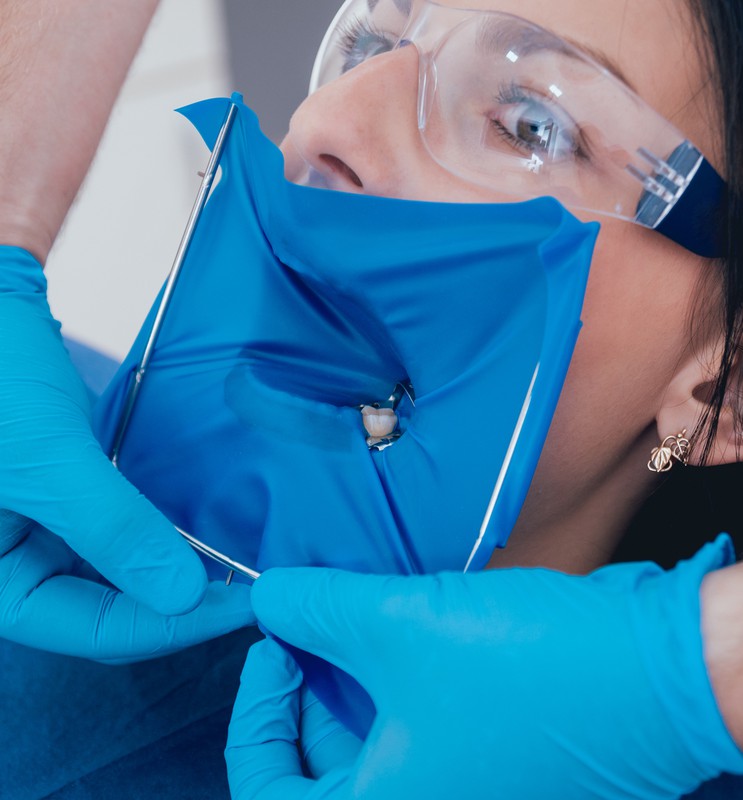 Met een rubberdam houden we de tand droog en vrij van speeksel — hygiënisch en ideaal voor een duurzame hechting.
